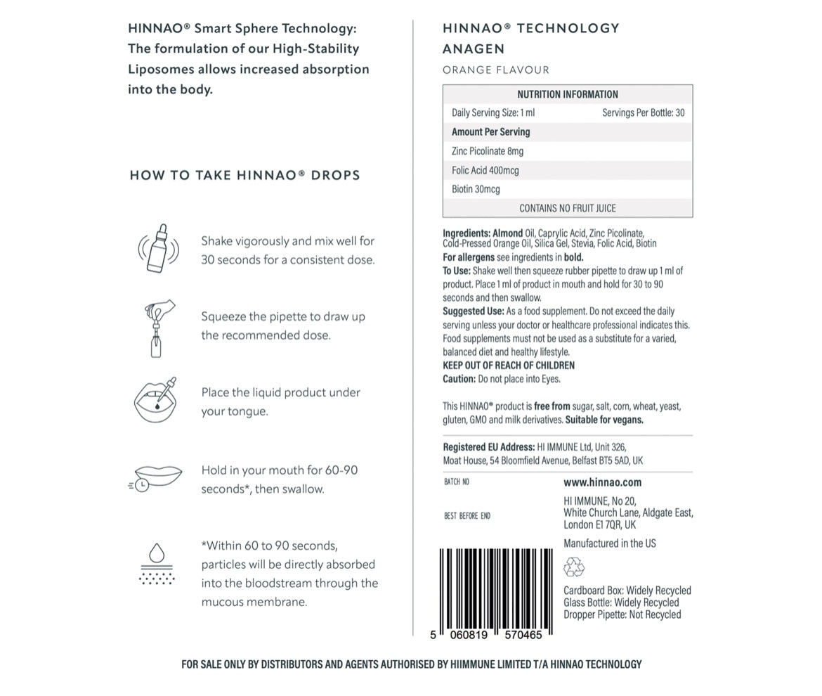 The word anagen refers to the growth phase of the hair cycle. When hair doesn’t seem to grow or constantly sheds, it may be a sign of a short anagen cycle. By combining biotin, zinc, and active folic acid (and removing added sugars and additives), HINNAO Anagen helps keep hair in the anagen phase, promoting hair tissue growth and repair and ensuring the oil glands around the hair follicle are functioning properly.